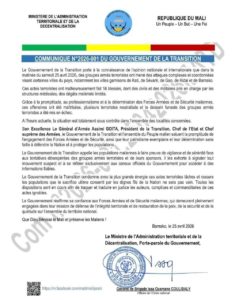 Le Gouvernement de la Transition porte à la connaissance de l’opinion nationale et internationale que dans la matinée du samedi 25 avril 2026, des groupes armés terroristes ont mené des attaques complexes et coordonnées visant certaines villes du pays, notamment les villes garnisons de Kati, de Sévaré, de Gao, de Kidal et de Bamako.