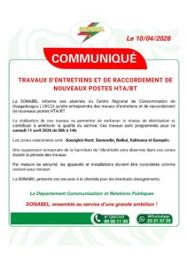 La SONABEL informe ses abonnés du Centre Régional de Consommation de Ouagadougou (CRCO) qu’elle entreprendra des travaux d’entretiens et de raccordement de nouveaux postes HTA/BT.